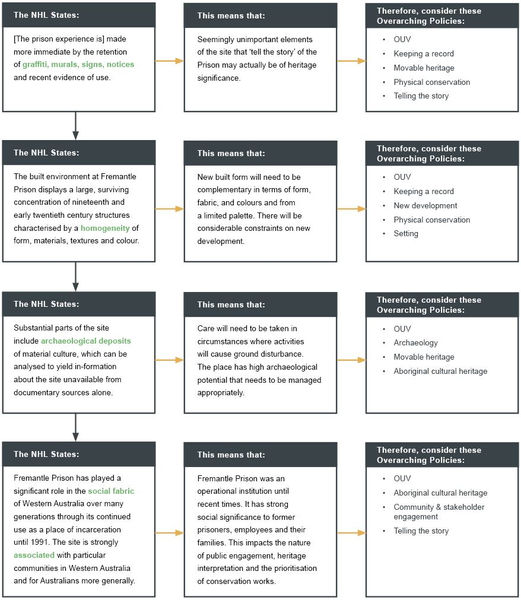 In other words, this HMP recognises that Fremantle Prison embodies a range of heritage values at different levels of significance. It envisages that these can usually co-exist, and that it will ordinarily be possible to conserve Fremantle Prison’s OUV without adverse impact